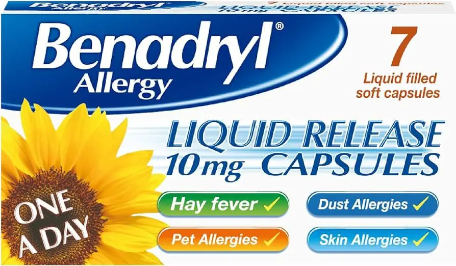 Benadryl Allergy Liquid Release Capsules 10mg 7s contain cetirizine, an antihistamine used to relieve symptoms associated with hay fever and other allergies, such as pet allergies, dust allergies, and skin allergies. Cetirizine helps alleviate symptoms like itchy nose, runny nose, sneezing, itchy eyes, watery eyes, hives, and itchy skin.