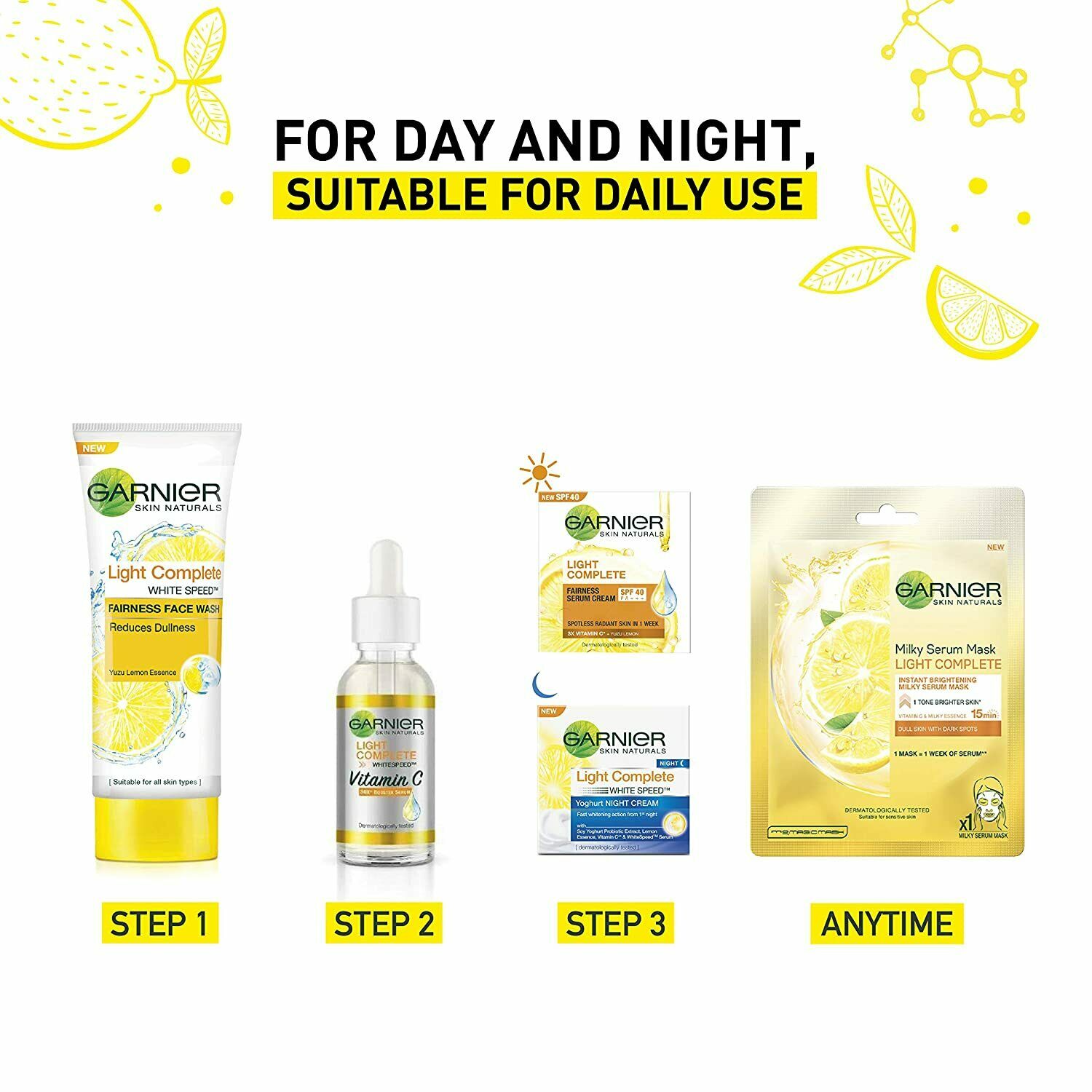 Cleanse your face with a mild Garnier Light Complete facewash and pat dry. Take a pea sized amount of the Vitamin C Booster Serum in your palms. Spread it between your palms without rubbing too much. Dab the serum all over your face and neck using small and gentle tapping motions. Follow with the Garnier Light Complete Serum Cream with SPF 40 in the morning and Light Complete Night Cream at night. For best results, use daily.