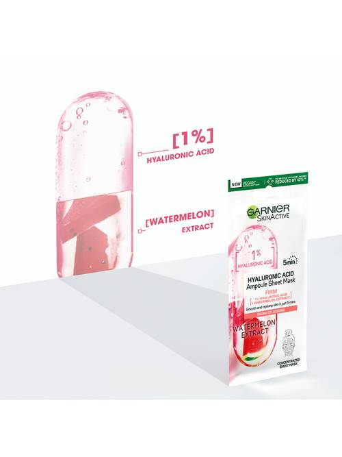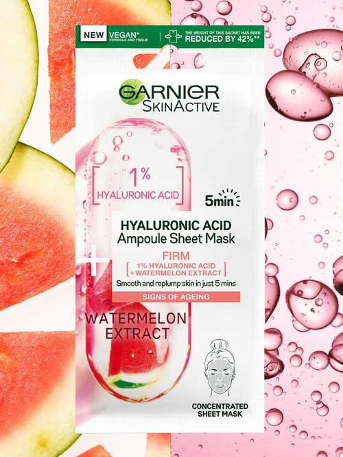 Garnier fast action Hyaluronic Acid + Watermelon ampoule sheet mask combines a potent derm active with a natural origin ingredient to replumb the skin with moisture for skin that looks firmer in just 5 mins! This sheet mask is made with both a vegan formula and tissue.