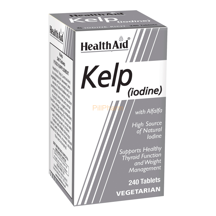 Health Aid Kelp is a special Norwegian oceanic plant source, which naturally provides amino acids, vitamins, minerals and trace elements. Kelp is especially rich in natural and highly bioavailable Iodine, essential for the synthesis of thyroid hormones, the proper functioning of the thyroid gland and the maintenance of various other important bodily processes.