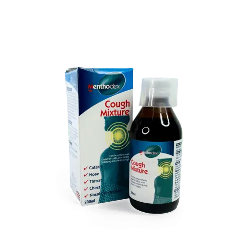 Menthodex Syrup 200ml is a cough mixture containing active ingredients such as ammonium chloride, levomenthol, sodium citrate, and squill tincture. It is used to relieve symptoms of colds, sore throats, and chesty coughs.