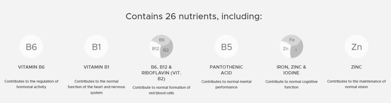 Maltodextrin, Bulking Agent: Microcrystalline Cellulose, Vitamin C (Ascorbic Acid [Carriers: Hydroxypropylmethylcellulose & Tartaric Acid]), Zinc Sulphate, Niacin (Nicotinamide), Tablet Coating (Hydroxypropylmethylcellulose, Polydextrose, Talc, Maltodextrin, Medium Chain Triglycerides, Colours: Titanium Dioxide, Iron Oxide Yellow, Copper Chlorophyllin [Natural Source]), Ferrous Fumarate, Thiamin (Vitamin B1 as Mononitrate), Phosphatidylcholine (from Soya), Silicon Dioxide, Anti-Caking Agents: Stearic Acid & Magnesium Stearate, Alpha Lipoic Acid, Vitamin E (D Alpha Tocopheryl Acid Succinate) (from Soya), Citrus Bioflavonoids, Vitamin B6 (Pyridoxine HCI), L-Carnitine Tartrate, Crosslinked Cellulose Gum, Betacarotene (Carriers: Starch, Water, Antioxidant: DL-Alpha Tocopherol), Vitamin D3 (Cholecalciferol, Acacia, Sucrose, Corn Starch, Medium Chain Triglycerides, Antioxidant: DL-Alpha Tocopherol), Lutein Esters (Sugar, Antioxidants: Natural Vitamin E & Ascorbyl Palmitate, Gum Acacia, Hydroxypropylmethylcellulose, Zeaxanthin Esters), Coenzyme Q10, Pantothenic Acid (as Calcium Salt), Riboflavin, Copper Sulphate, Manganese Sulphate, Chromium Trichloride, Sodium Selenate, Folic Acid (as Pteroylmonoglutamic Acid), Potassium Iodide, Vitamin B12 (Cyanocobalamin), Biotin. Allergy Advice: For allergens, see ingredients in bold.